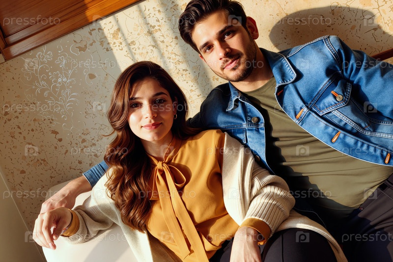 Портрет молодого человека и женщины, сидящих вместе и отдыхающих в помещении