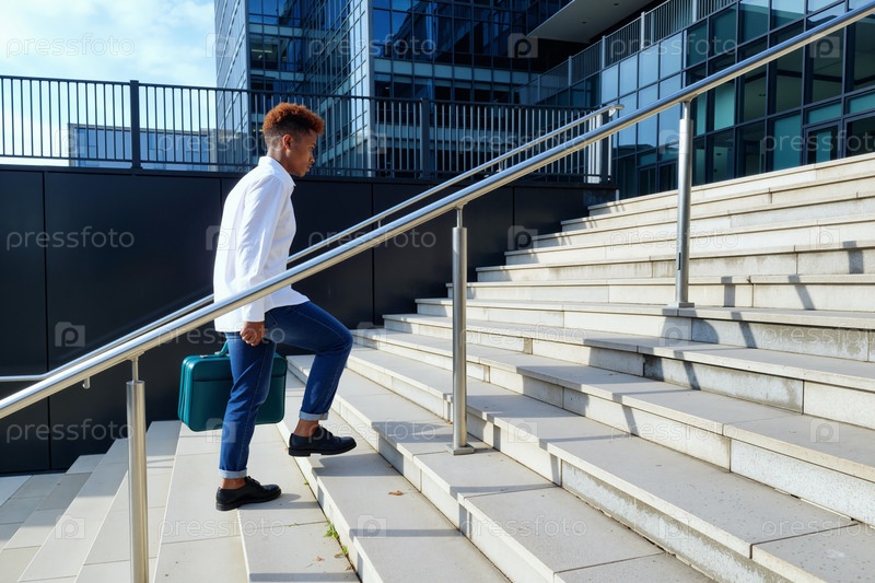 Молодой взрослый чернокожий мужчина поднимается по наружной лестнице, неся портфель возле офиса