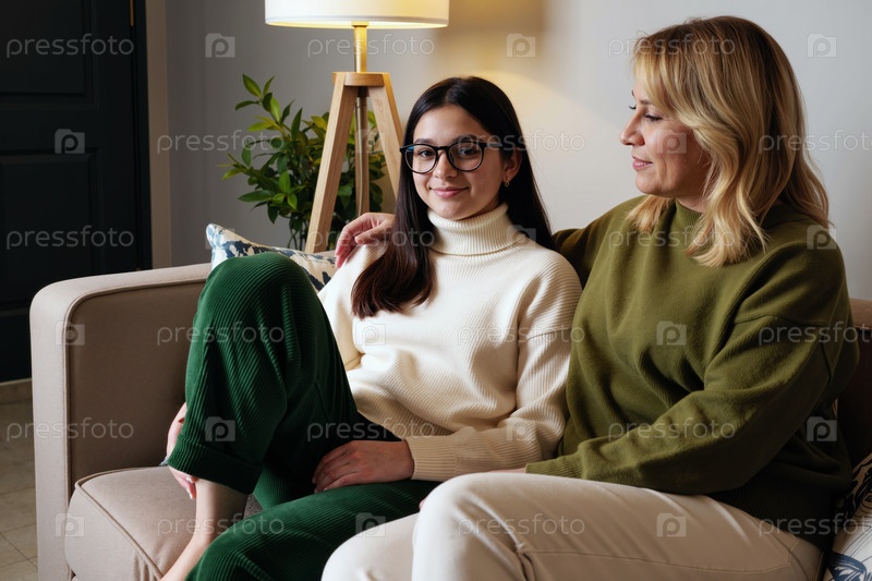 Женщина среднего возраста обнимает дочь-подростка, сидящую в помещении