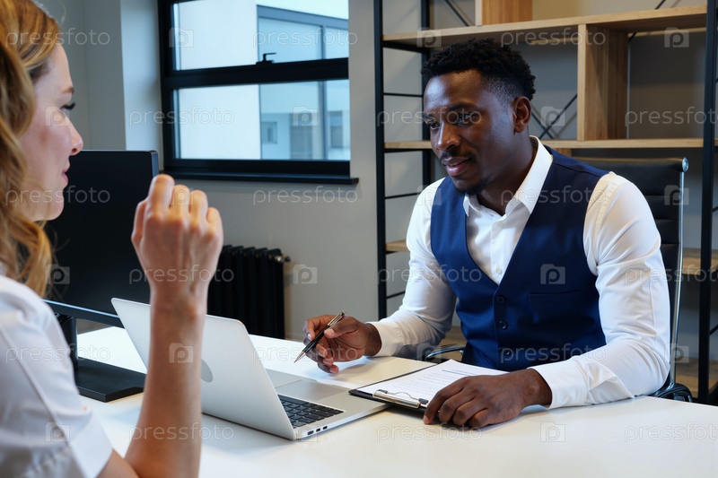 Молодой взрослый чернокожий мужчина интервьюирует женщину в современной офисной обстановке