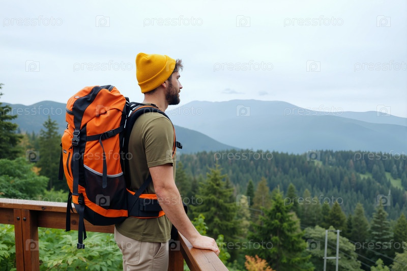 Молодой человек ходит в горы и восхищается живописным пейзажем