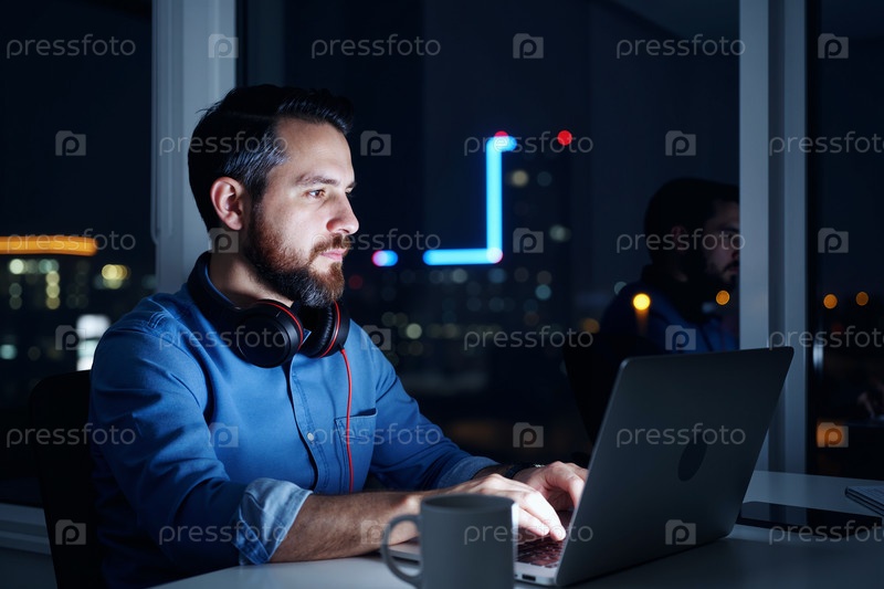 Молодой взрослый мужчина работает на ноутбуке ночью в современном офисе