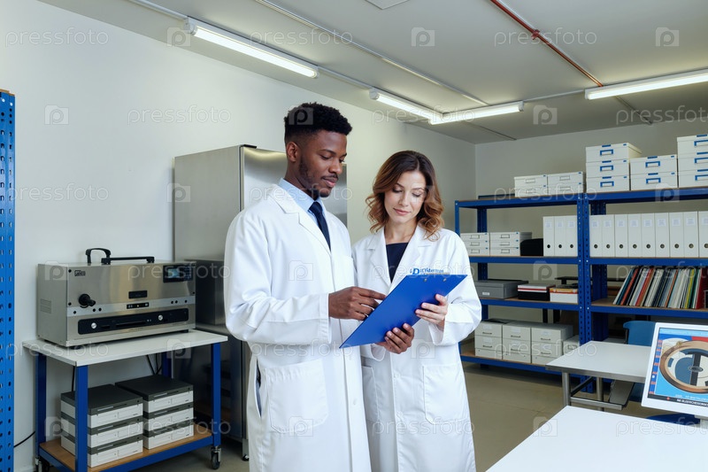 Молодой чернокожий мужчина и женщина обсуждают исследования в лаборатории