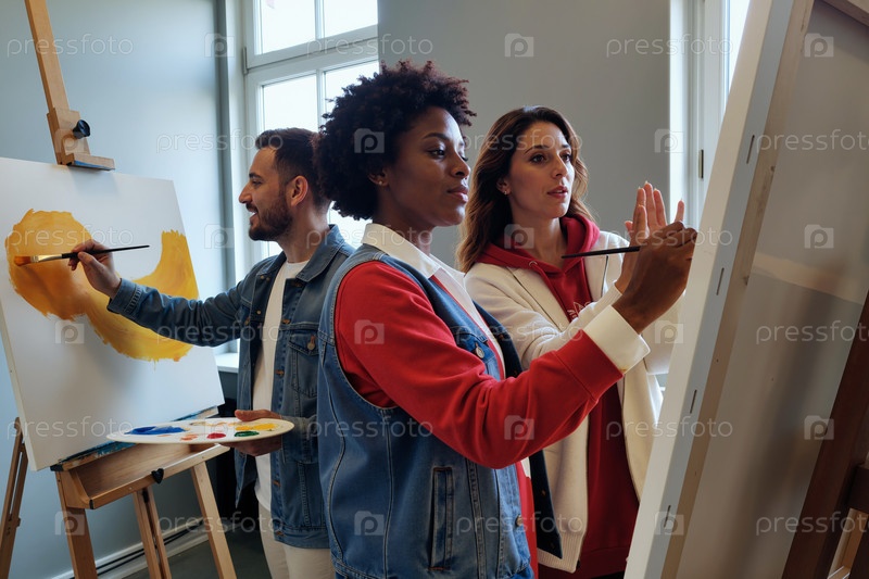 Молодые мультиэтнические взрослые рисуют вместе во время мастерской искусства в помещении
