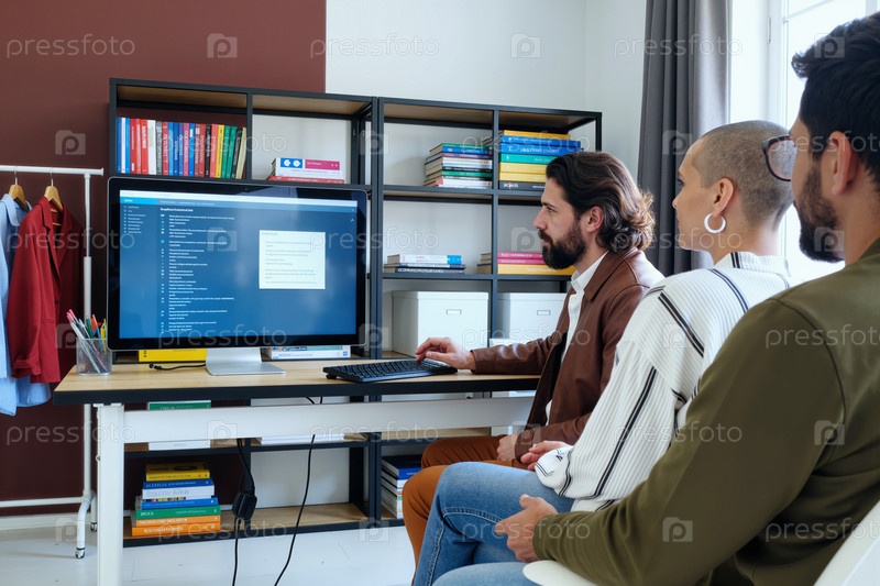Молодой человек объясняет компьютерный код мультиэтническим молодым взрослым