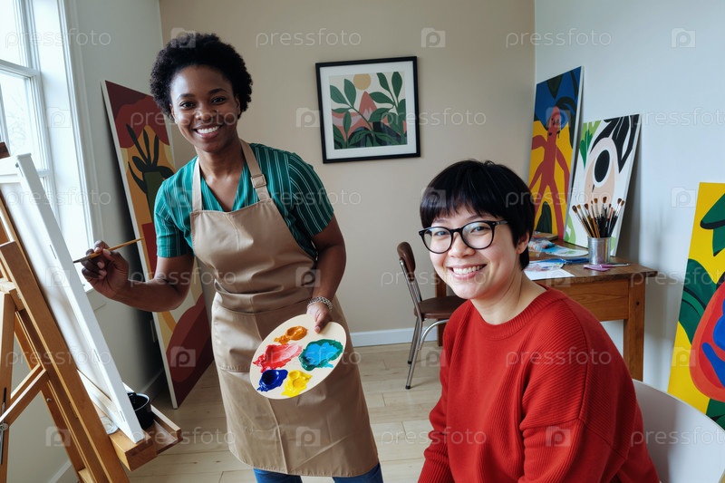 Молодые взрослые мультиэтнические женщины рисуют вместе в яркой художественной студии