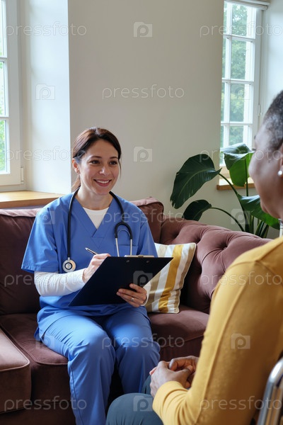 Молодой взрослый женщина медсестра консультирование среднего возраста чернокожая женщина пациент