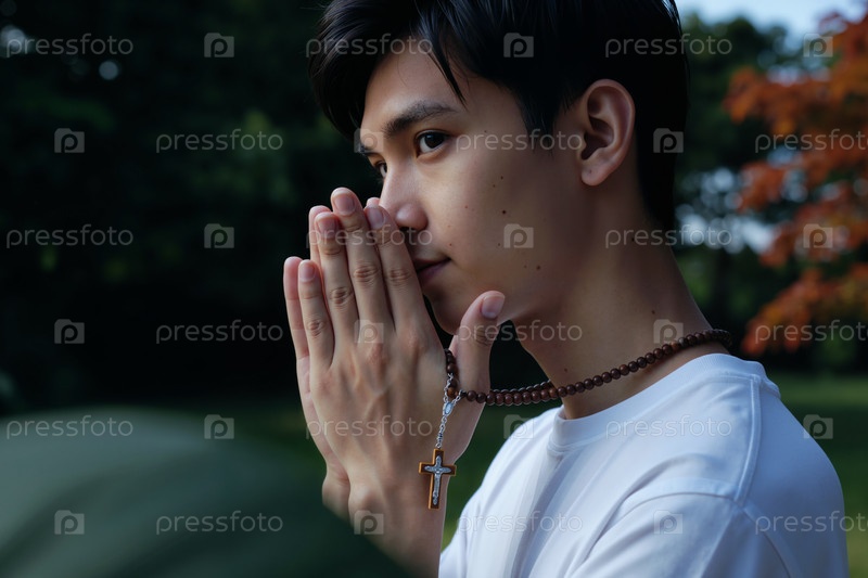 Молодой азиат молится на свежем воздухе, держит в руках молебен с крестом