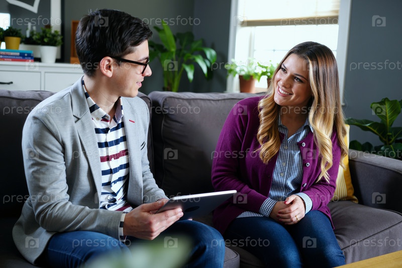 Молодой человек показывает планшет улыбающейся молодой женщине в помещении
