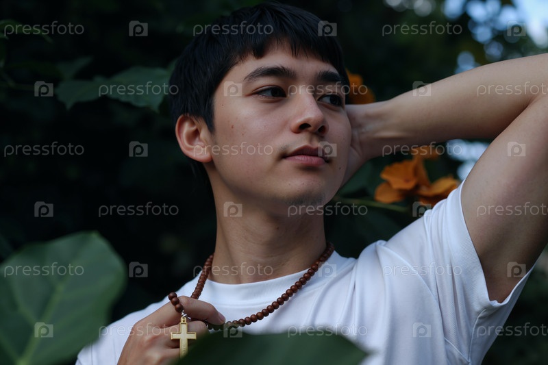 Молодой азиатский мужчина стоит снаружи, держит в руках розарий и смотрит наружу