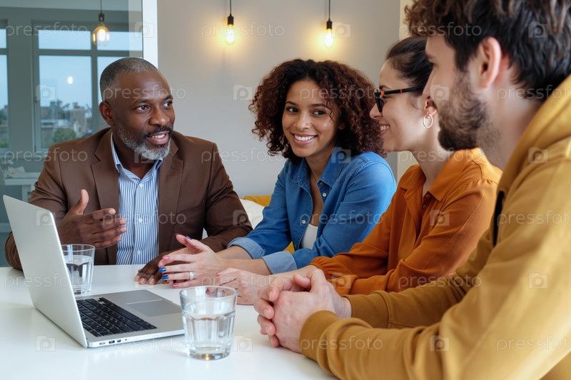 Мультиэтнические молодые взрослые сотрудничают во время деловой встречи в офисе