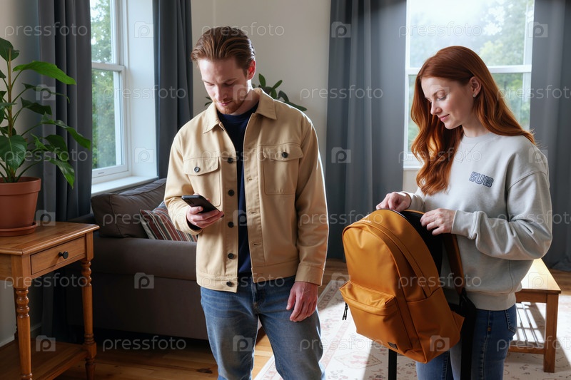 Молодой человек пользуется смартфоном, в то время как молодая женщина собирает рюкзак