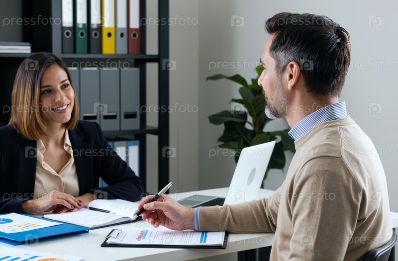 Молодой человек обсуждает бизнес-стратегию с молодой испаноязычной женщиной