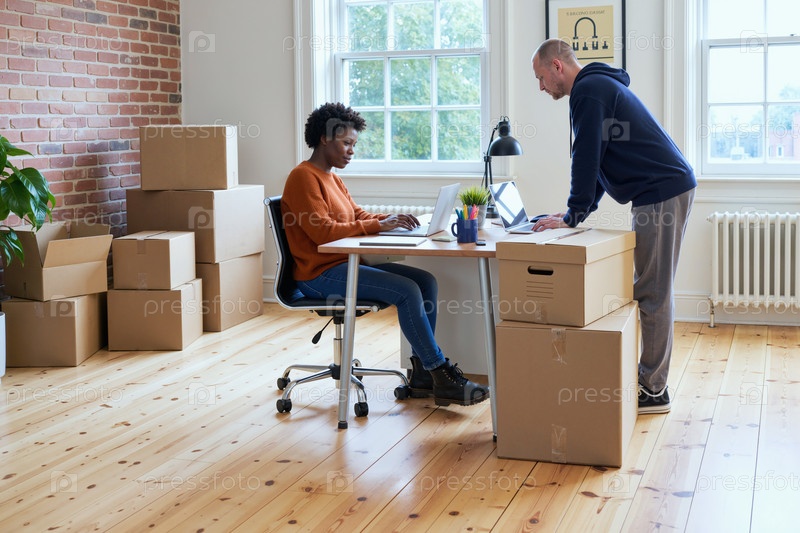 Молодой мужчина и молодая чернокожая женщина работают вместе во время переезда в офис