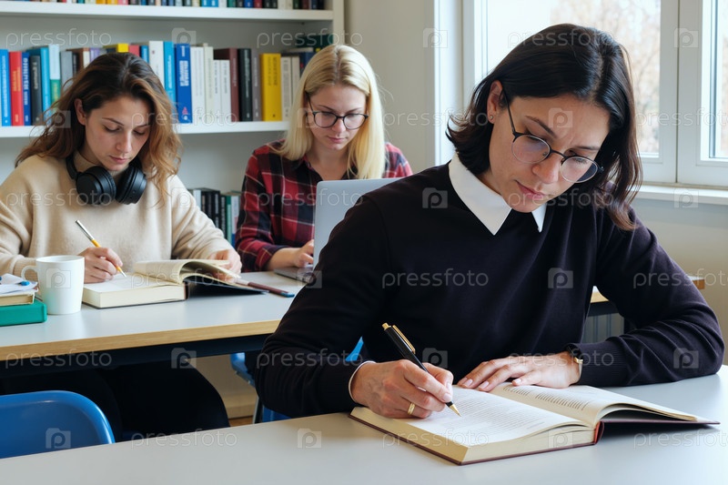 Молодые взрослые женщины изучают и делают заметки в университетской библиотеке