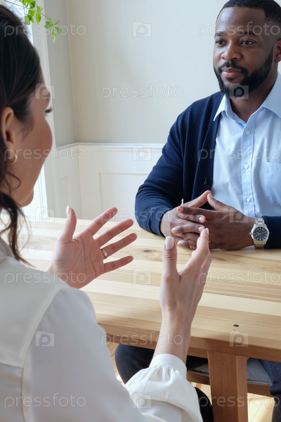 Молодая женщина обсуждает бизнес с молодым чернокожим мужчиной за столом