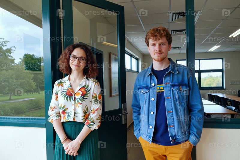 Молодая женщина и молодой мужчина стоят в классе, улыбаясь