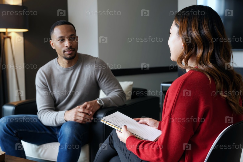 Молодая женщина интервьюирует молодого чернокожего мужчину во время консультации