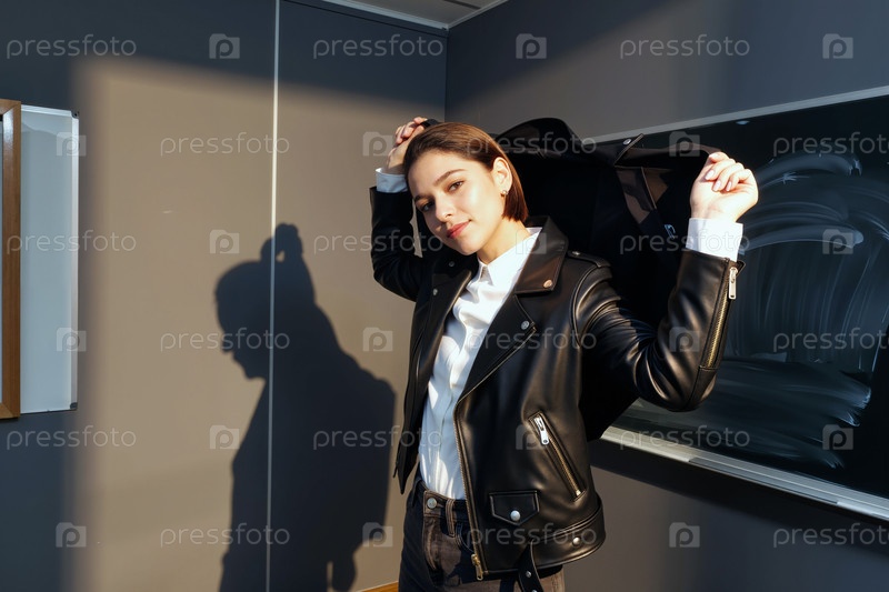 Портрет молодой взрослой женщины, надевающей куртку в классе