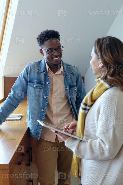 Юный чернокожий мужчина улыбается, разговаривая с молодой женщиной