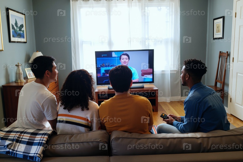 Группа молодых взрослых друзей, смотрящих телевизор вместе в гостиной