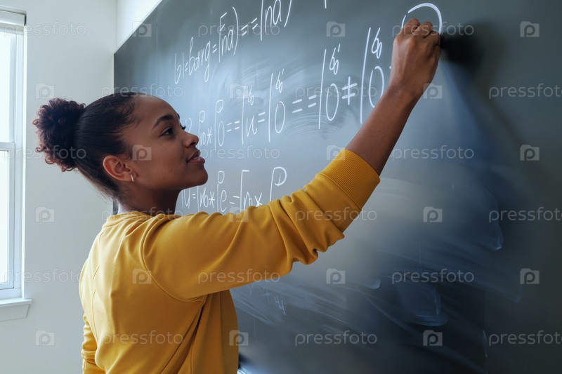 Чернокожая девочка-подросток решает математические уравнения на доске в классе