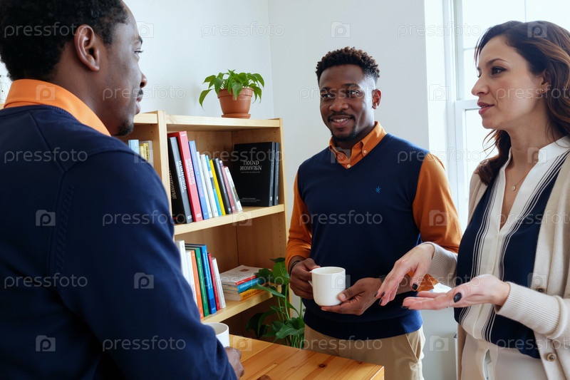Молодые взрослые многонациональные коллеги по работе общаются во время перерыва на кофе в офисе