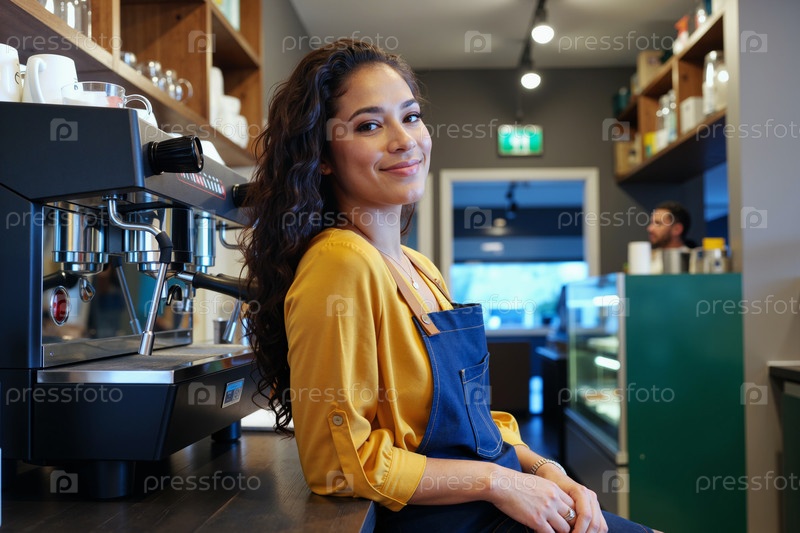 Портрет молодой взрослой латиноамериканской женщины, улыбающейся во время работы в кофейне