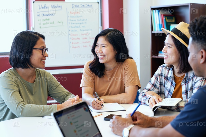 Группа молодых взрослых азиатских женщин, сотрудничающих во время командной встречи в помещении