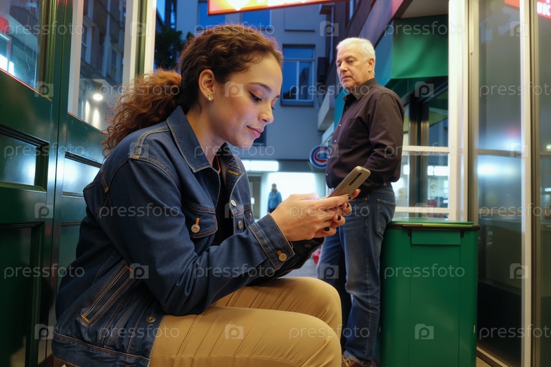 Молодая женщина использует смартфон, в то время как мужчина среднего возраста смотрит