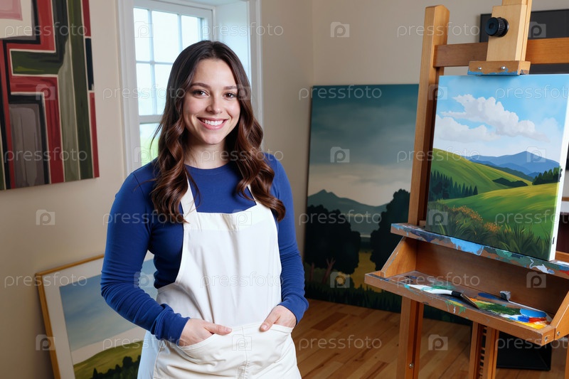 Портрет молодой взрослой женщины, улыбающейся во время рисования пейзажа