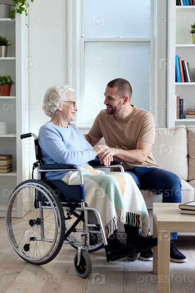 Женщина с инвалидностью улыбается молодому старшему мужчине
