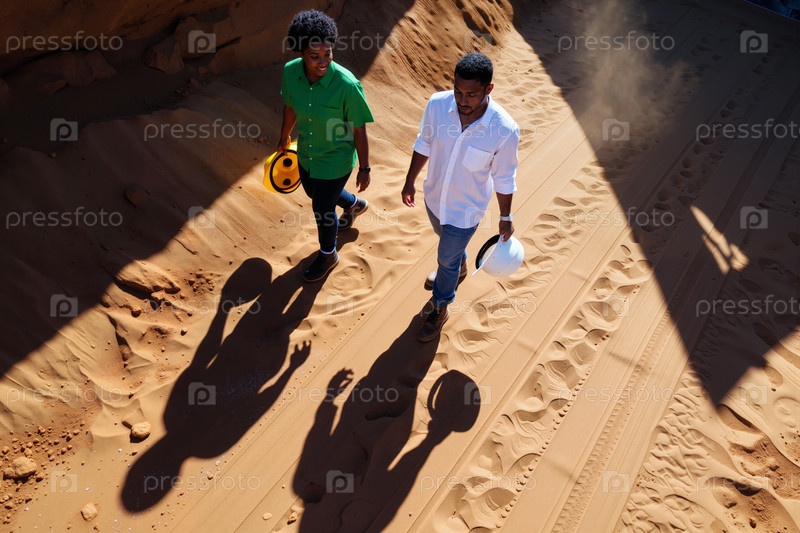 Два молодых взрослых чернокожих мужчины ходят по песчаной стройплощадке, держа жесткие шляпы