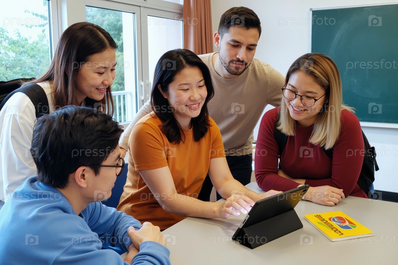 Многонациональные молодые взрослые сотрудничают вокруг планшета в классной обстановке
