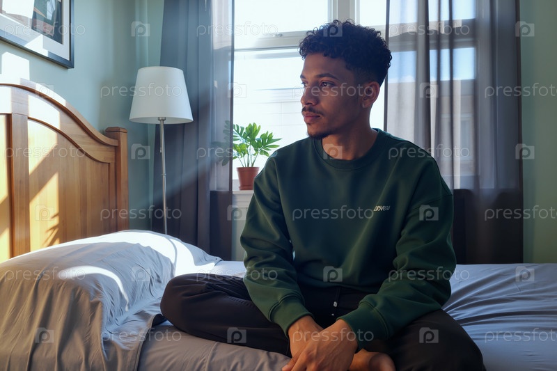 Молодой чернокожий мужчина сидит на кровати, отражая солнечный интерьер спальни