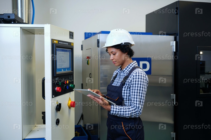 Молодая взрослая женщина эксплуатирует промышленную машину с помощью цифрового планшета