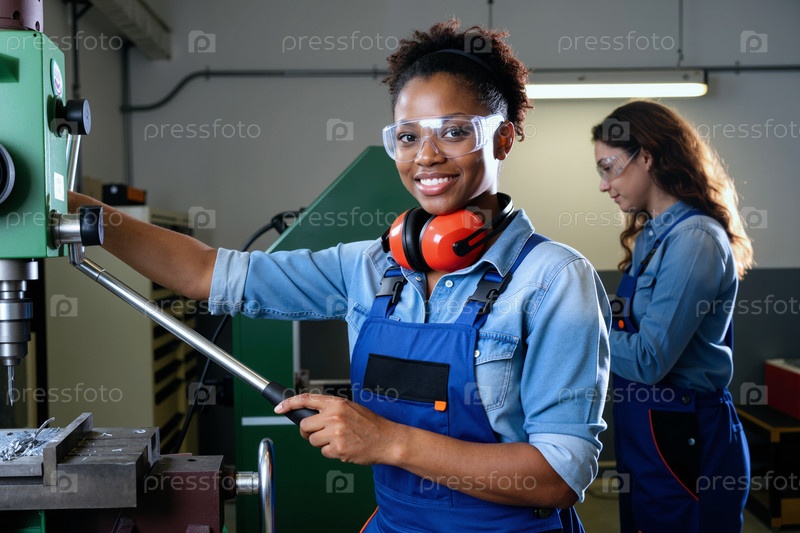 Молодая взрослая чернокожая женщина эксплуатирует промышленную машину в производственной мастерской
