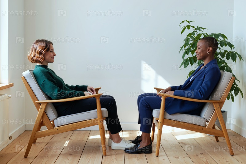 Две молодые взрослые женщины сидят лицом к лицу, разговаривая в помещении