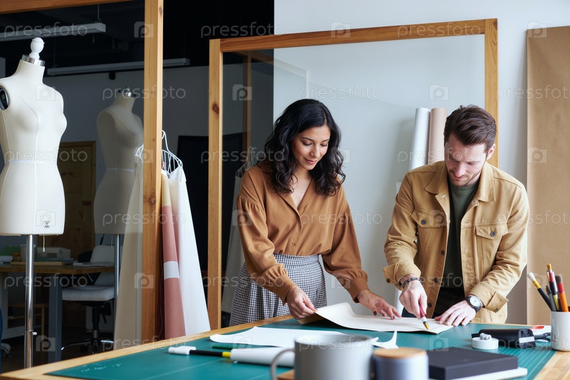 Молодой мужчина и молодая женщина сотрудничают над проектом модного дизайна