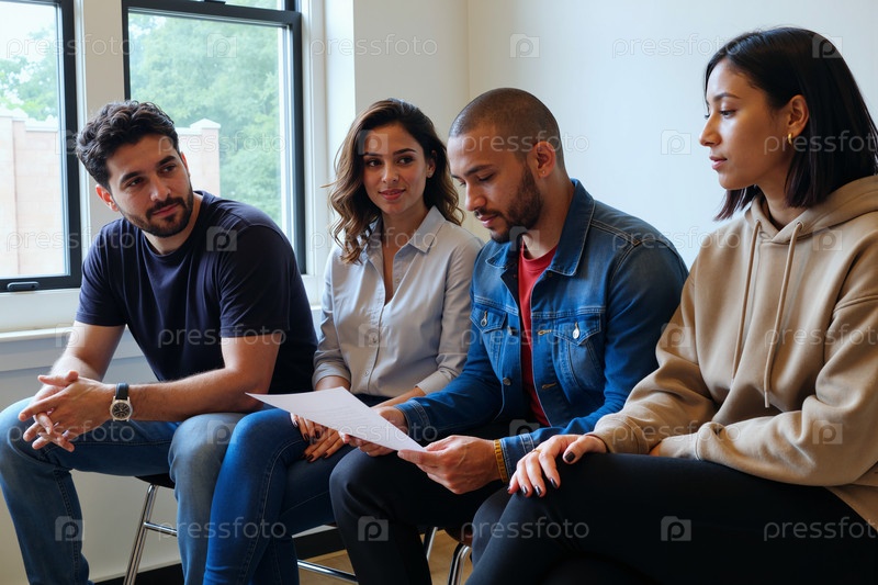 Мультиэтнические молодые взрослые сидят вместе, обсуждая документ в офисе