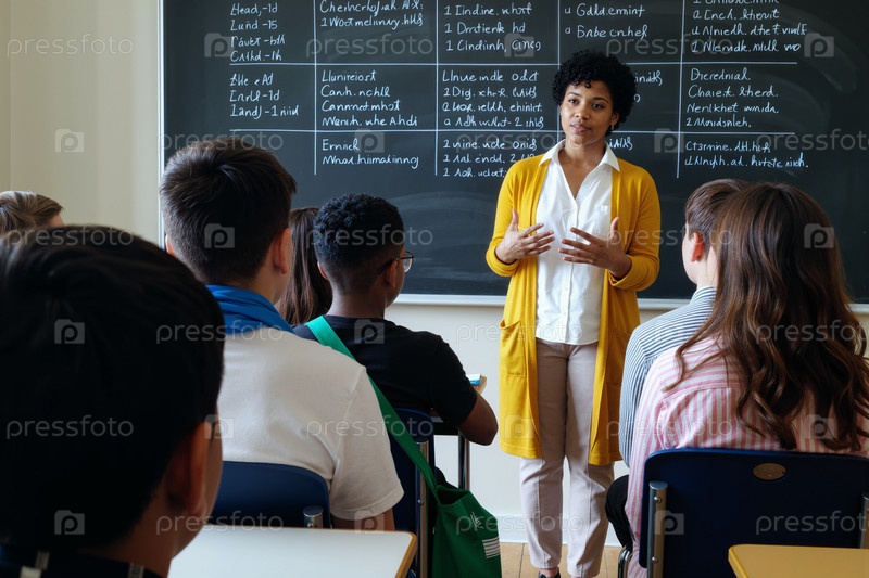 Молодая взрослая чернокожая женщина обучает различных подростков в классной обстановке