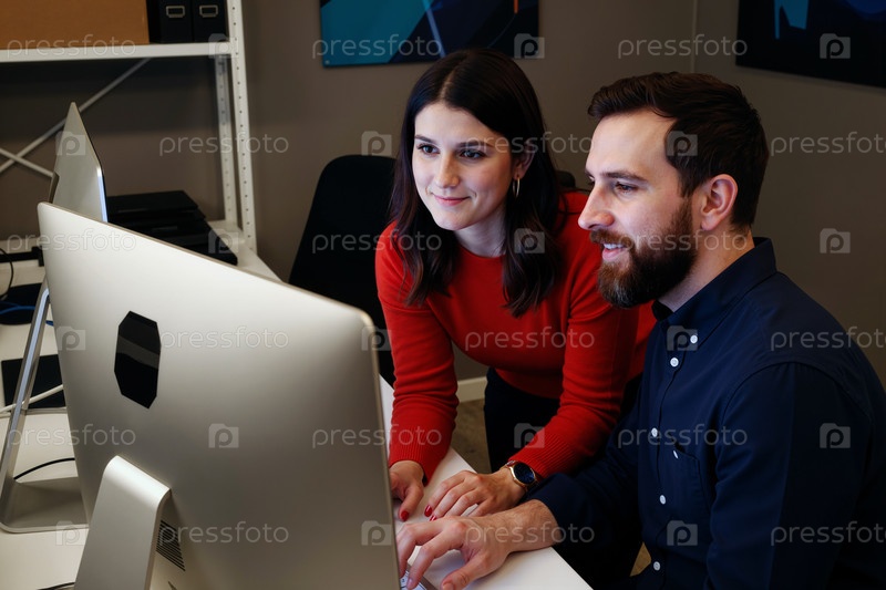 Молодая женщина и молодой человек сотрудничают на компьютере