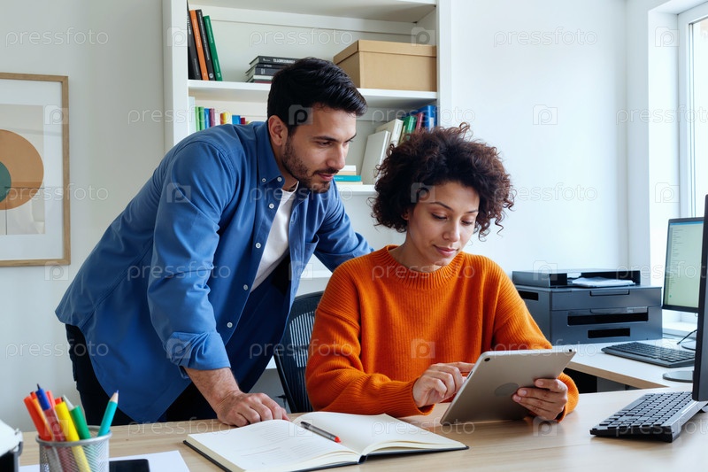 Молодой мужчина и молодая чернокожая женщина сотрудничают с помощью цифрового планшета