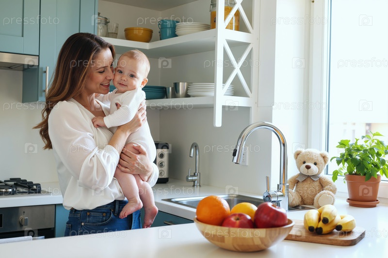 Молодая взрослая женщина держит улыбающегося ребенка на современной кухне