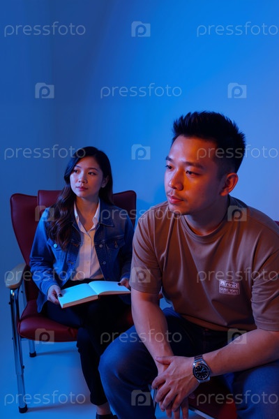 Молодой азиатский мужчина сидит вдумчиво, пока молодая азиатская женщина делает заметки