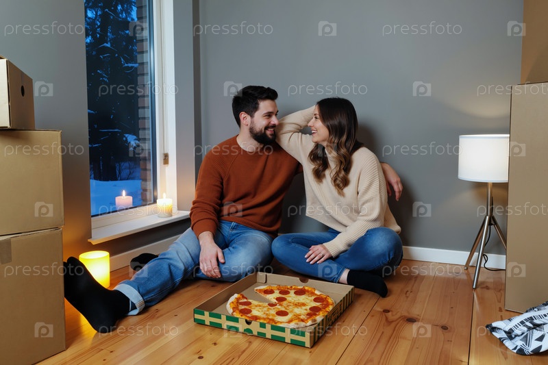 Молодая пара сидит на полу, ест пиццу во время переезда домой