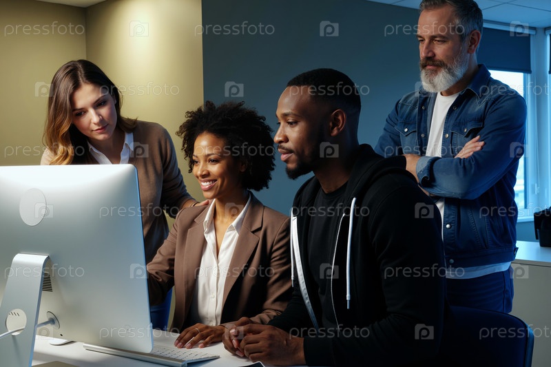 Мультиэтнические молодые взрослые и мужчина среднего возраста, сотрудничающие на компьютерной рабочей станции
