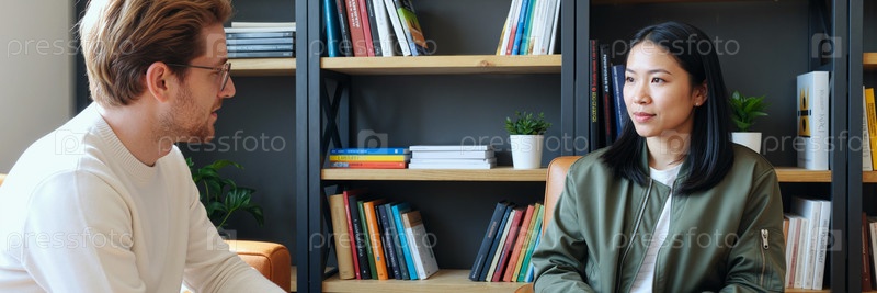 Молодой мужчина и молодая азиатская женщина ведут серьезный разговор в помещении