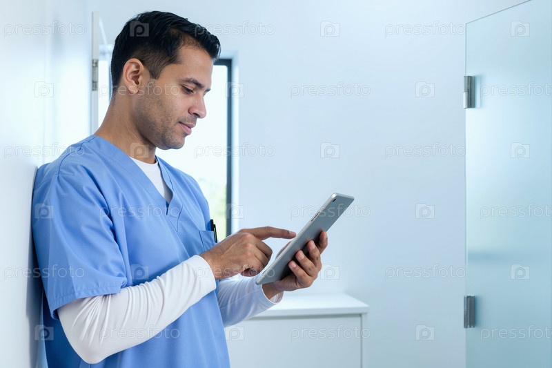 Молодой человек в скрабах использует цифровые планшеты в медицинском кабинете