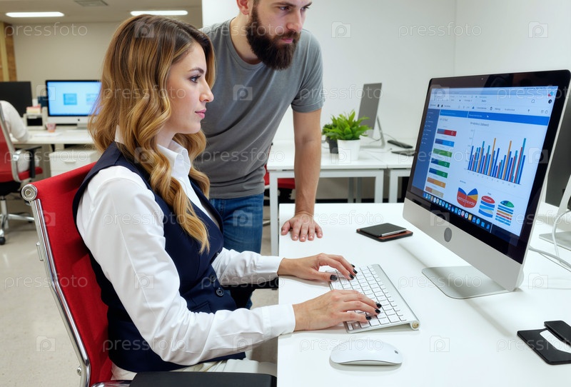 Молодая женщина анализирует бизнес-данные, в то время как молодой человек наблюдает